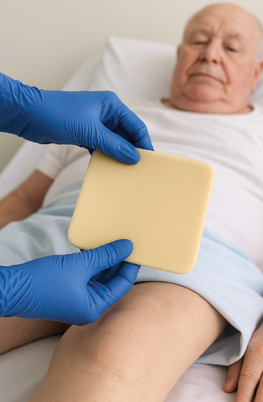 Tato kombinace zajišťuje účinnou absorpci exsudátu, ochranu před vnější kontaminací a šetrné sejmutí bez poškození okolní pokožky.